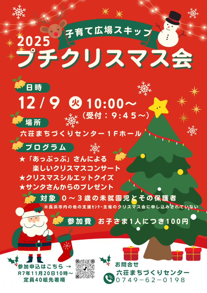 備考:プチクリスマス会当日の午前中は通常の子育て広場スキップはお休みとなります。午後は開所します。